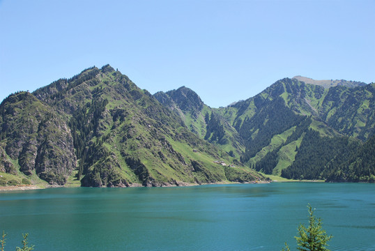 向更远处望去,南面的博格达雪峰巍峨庄严,与天池交相辉映,高山、雪峰、森林、草甸、河谷以及向远方延伸的戈壁大漠融于一景,形成独立而又交织共生的地质地貌奇观,呈现出别具一格的迷人风光。