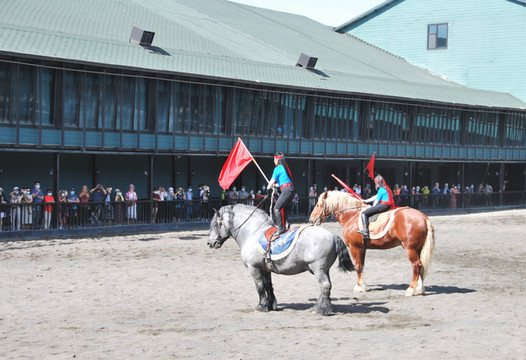 两位美女骑手驾驭着世界上最大的马上场。