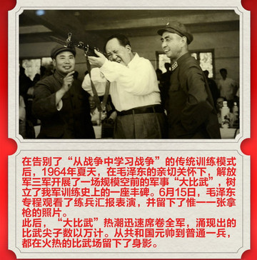一座毛主席立姿端枪的雕塑,创意并非凭空想象,它源自1964年毛主席观看大比武表演时的一幅照片。
