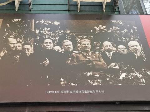 罕见老照片,毛主席1949年12月访问苏联时与斯大林在一起,赫鲁晓夫也在。