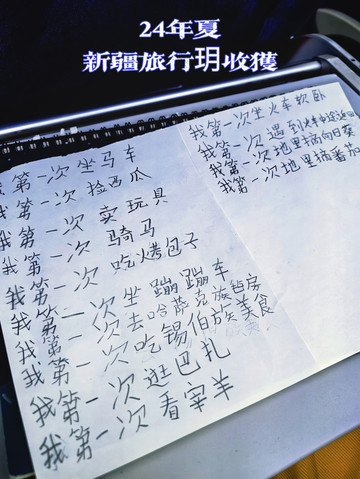 这次新疆游,玥有很多人生中的第一次,返程飞机上,玥整理着清单:第一次坐马车、第一次捡西瓜、第一次卖玩具、第一次…