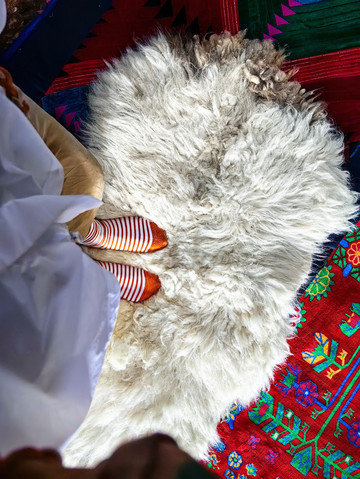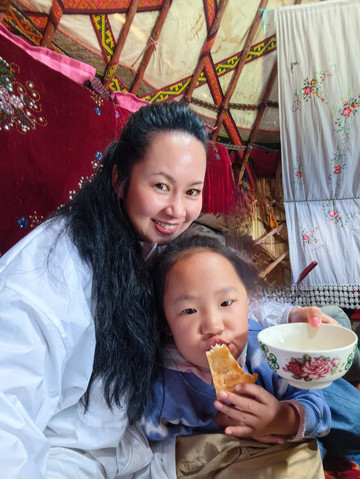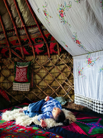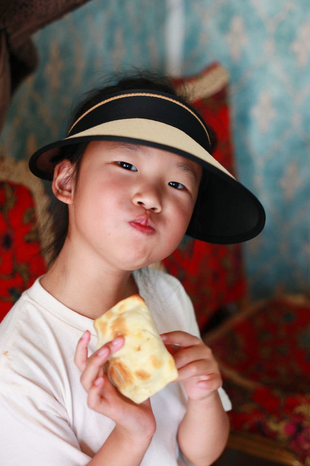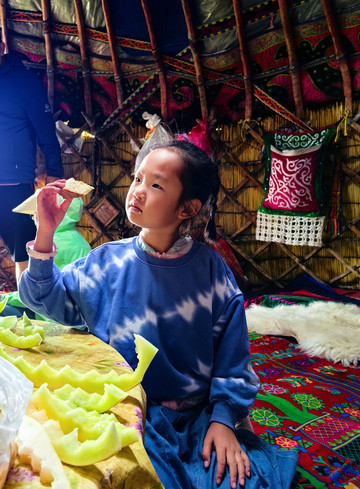 山顶的夏牧场,在为数不多哈萨克民族自己生活的毡房里歇息。主人拿出自制的包尔萨克、哈萨克馕、奶疙瘩,现煮了奶茶。