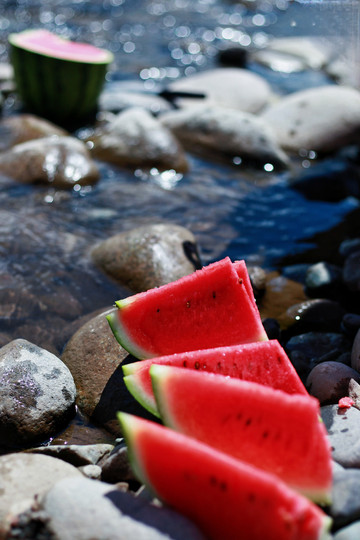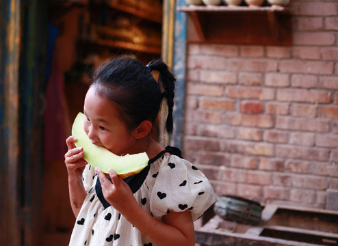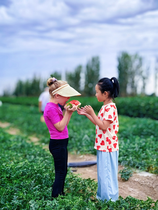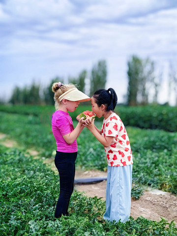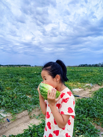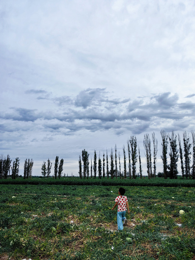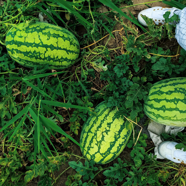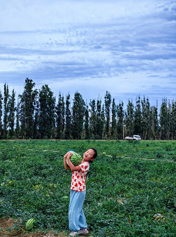 瓜田里捡瓜。头一回看到满地的瓜,瓜比脸大,边捡边吃,不亦乐乎。