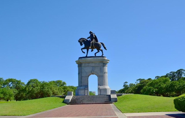 高大的白色大理石砌成的凯旋门上,矗立着一尊德克萨斯先驱者山姆.休斯顿将军的铜雕像。照片摄于赫曼公园。