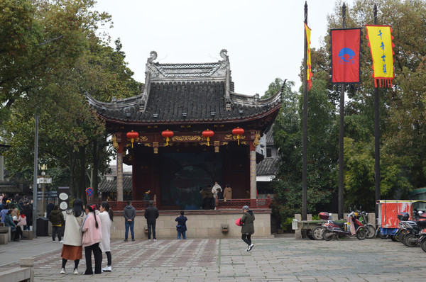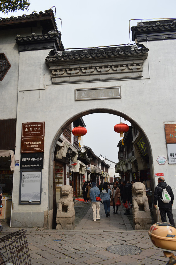 购票后我们进入古镇,一股热闹的气氛扑面而来,街上人流摩肩接踵。街一侧是潺潺的流水,一侧是街边的商店里琳琅满目的同里特产。踩着石板路,伴着小河,跨过小桥,一路往南。因为游客不少,加上我们拿着行李,没有停留欣赏,直奔目的地竹行街的客栈。入住之后,带上相机就迫不及待地出门了。
