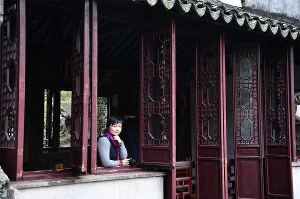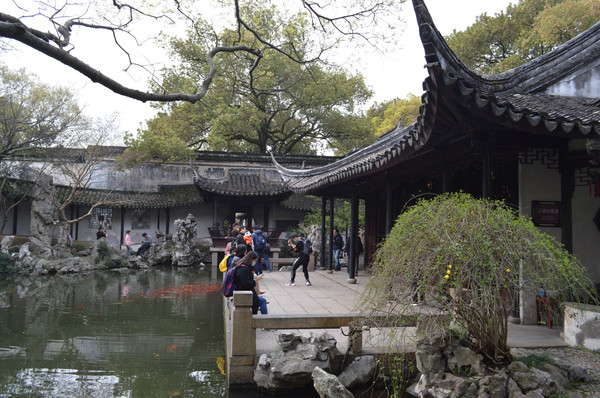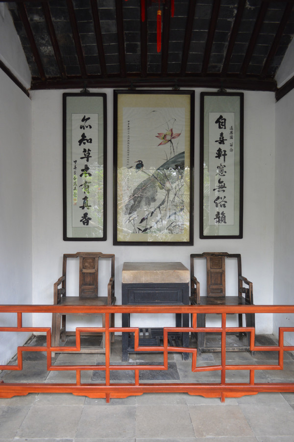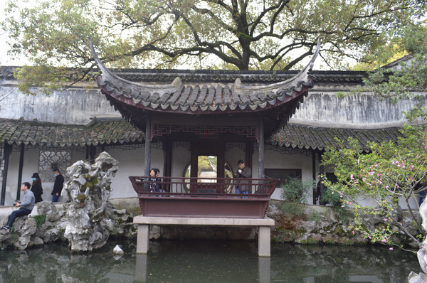 穿过庭院的圆门就是花园,花园入口处紧贴着中庭高大的粉墙就是水香榭。水榭歇山卷棚大戗角,悬挑水面,与退思草堂隔水互为对景。滨水的三面围有美人靠,现在则是游客们用来赏景的座椅。