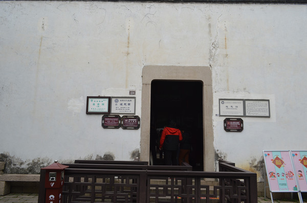 白色高大的院墙上一个小小的门脸,如此的不显眼,都令我心生疑惑。门边悬挂着几块身份牌。左一是园子落成的时间——清代。左二是一块联合国教科文组织2000年11月授予退思园为世界文化遗产的牌匾。右二是介绍了退思园是丽则女校的旧址,右一是用简单的文字介绍了退思园。从这简单的几块牌匾就能得知建于清光绪十一年至十三年(公元1885-1887年)退思园,是主人任兰生遭人弹劾返乡"退而闻思"的住所,而且是一座世界文化遗产。