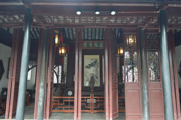 再移数步来到花园的主景建筑退思草堂。退思草堂坐北朝甫,草堂古朴素雅,不求华丽,无论是门窗装饰,还是家具陈设,处处体现了这一思想。