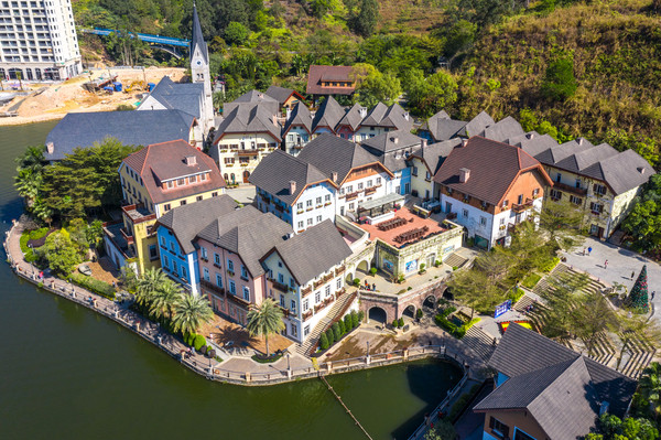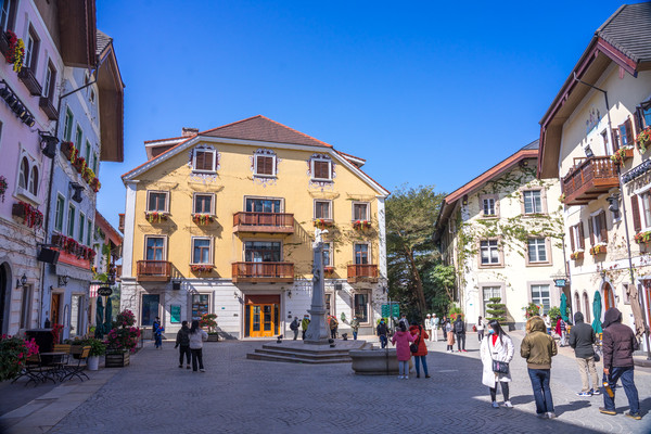 游览完了西湖就来到了惠州市郊的五矿哈施塔特小镇,进入大门后,平静的人工湖畔坐落着成片的欧式建筑,走进小镇中心的时代广场,看着这些欧式建筑,还真有一刹那间的晃神仿佛自己正漫步在国外的感觉,缤纷的建筑在夕阳的暖色调下更加有欧式情调。