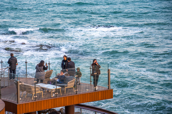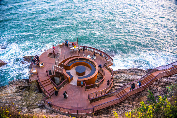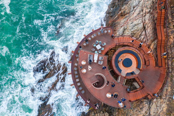 下午终于来到了期待的惠州礁石悬崖酒吧,亲眼所见真的很震撼,依着悬崖边礁石上搭建起来的旋转式下层酒吧,就像嵌在礁石上一样,汹涌澎湃的浪涛拍打着礁石。可以坐着凹造型,站着看海拍拍照片,基本张张都是大片。