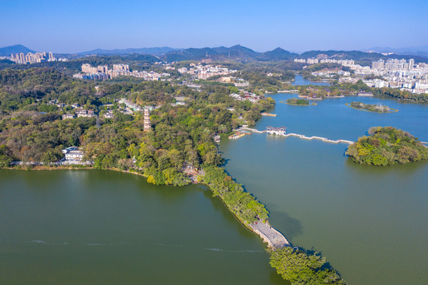 湖岸弯环曲折,整体则是三面都被青山环抱,在烟波浩淼的湖面上,堤桥如带,把湖面总体切割成为5大部分,素有“五湖六桥”之称。北宋大文学家苏东坡赞美惠州“山水秀邃”。也是苏东坡这个著名的大文学家成就了这西湖的盛名。
