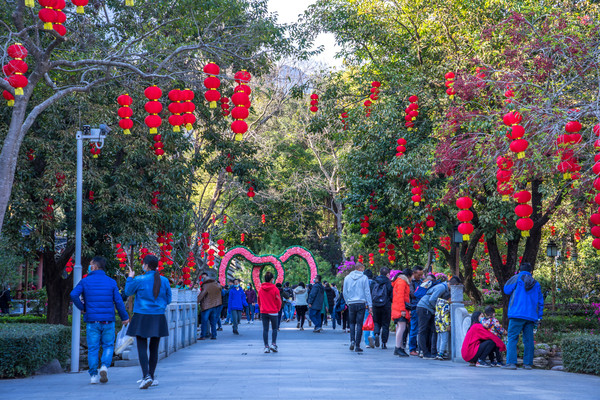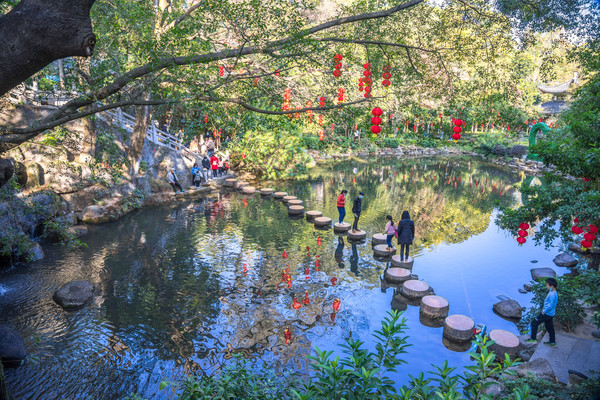在罗浮山 ,一进景区就感受到了春节过年的气息,火红的灯笼高高挂,深山树林凉亭溪水,植被繁茂常绿,林木高大森古,悠然自得,感觉很舒适。