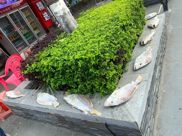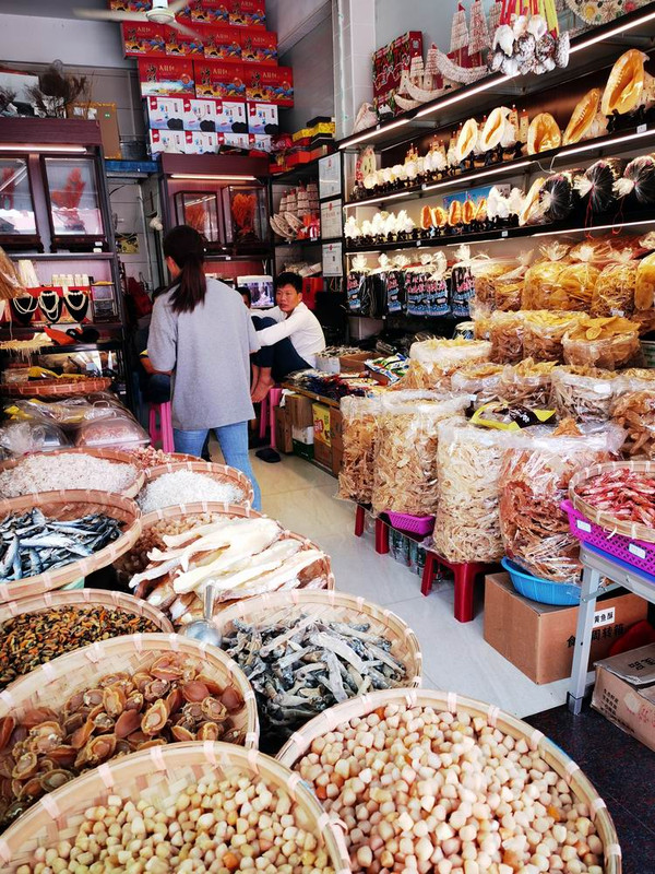店铺里有各具特色的岭南工艺品和当地的土特产。这是一家卖水产品的店铺。