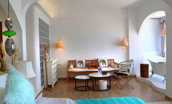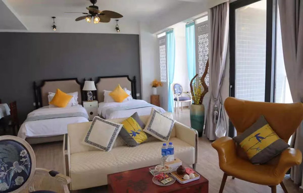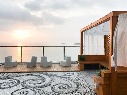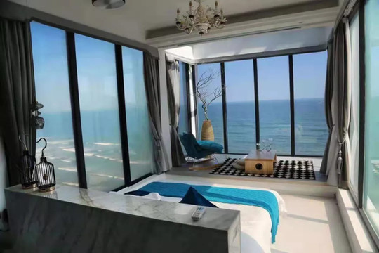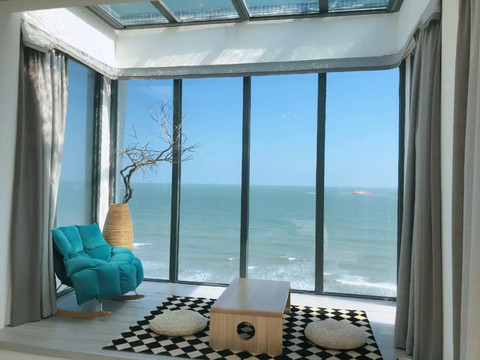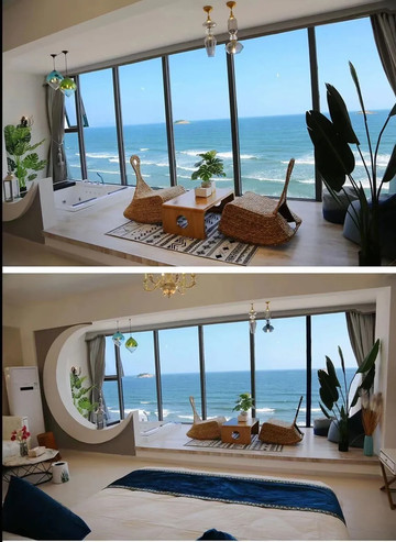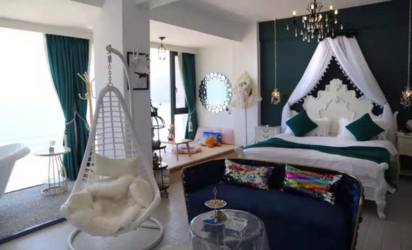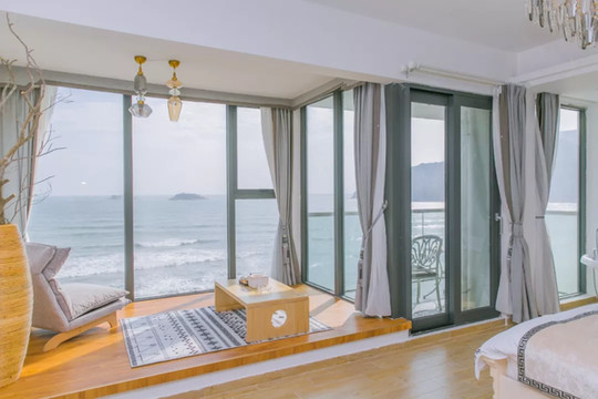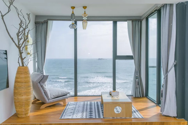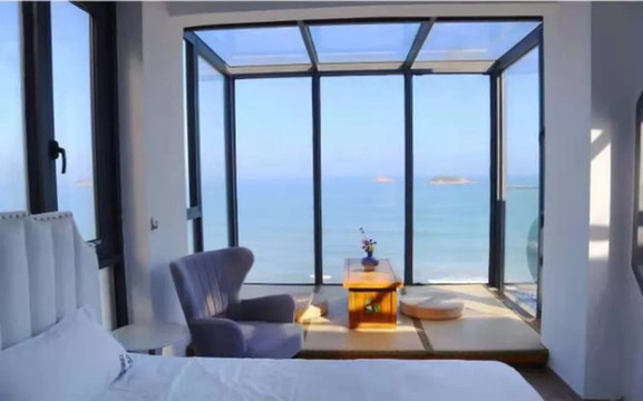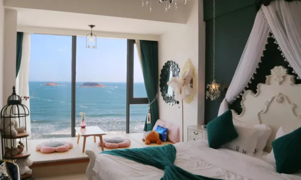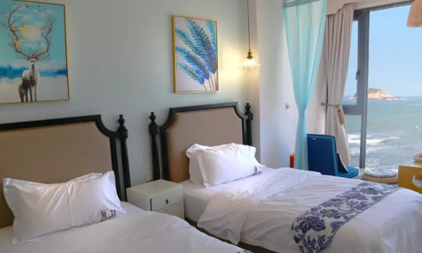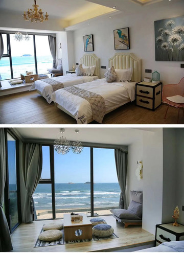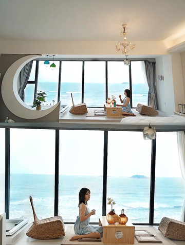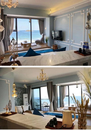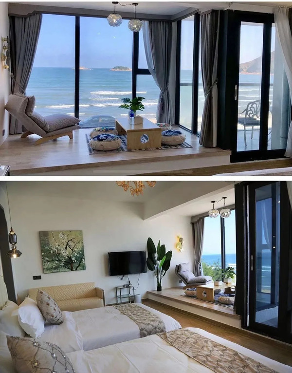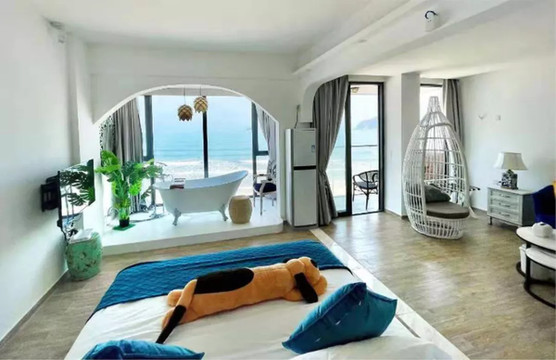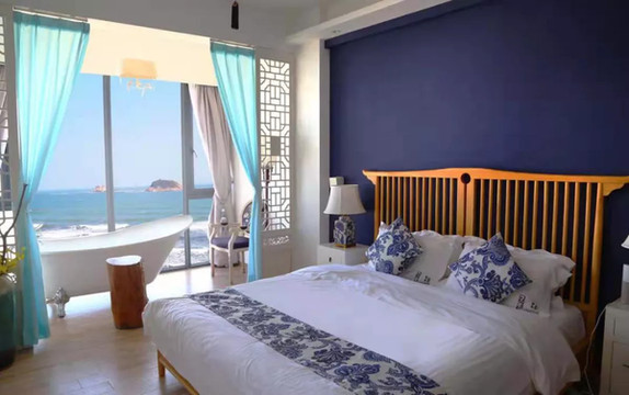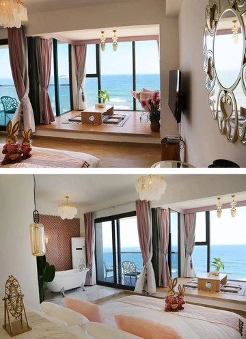 ♡新中式风格装修,大小12间客房,风格各异,有新中式风格,浪漫爱琴海风格,黑白格调风格等,间间看海,每间客房卫生间配备电动冲水吹风高级坐厕!