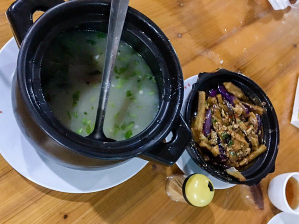 顺便就在边上的鱼排海上饭店吃晚饭,点了个螃蟹粥,一个茄子煲,一个空心菜