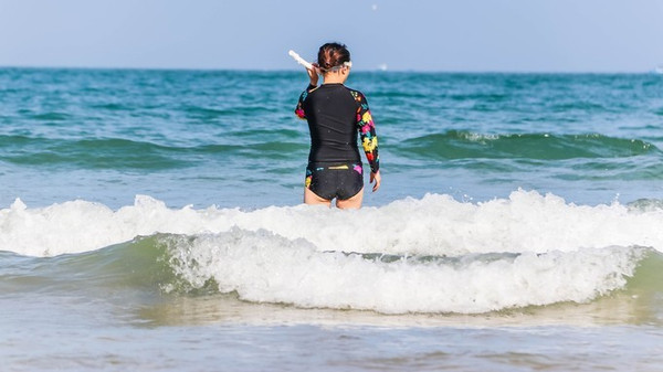 江艳下海找地儿自由潜,结果。。。。浪大,水混,啥么子都看不到,不过10分钟就失落的回来了