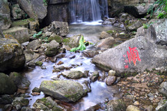 经过一段倒挂嶙峋的岩石,便来到了天坑里面,阳光从坑口照入天坑底部,山泉水从天空及绝壁而降,整个天坑内流水潺潺,非常幽深凉爽,绝对是避暑圣地。