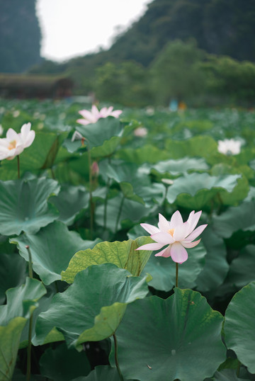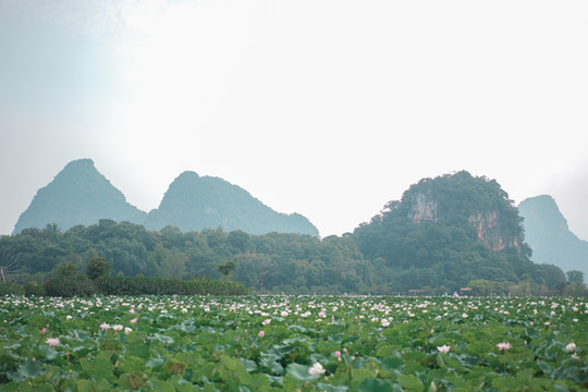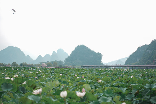 现在正是荷花盛开的时候,峰林莲湖300余亩的荷花正在热烈盛放,一眼望去,远处山峰映衬下的田田荷叶连绵不绝,期间或白色或粉色的荷花探出来,微风吹过,还带来阵阵的荷香。
