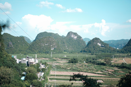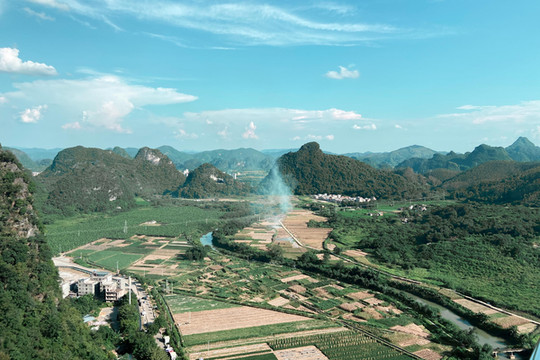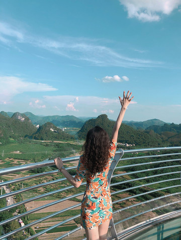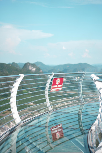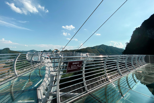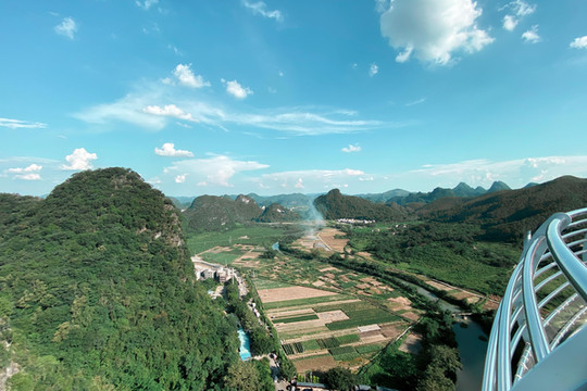 站在玻璃桥上,远处的蓝天白云、青山田野便呈现在眼前,天空之中白云朵朵,峰林延绵错落,喀斯特地貌独特的山势婀娜延绵,山下是碧绿棕黄交错的田野和错落有致地村落,村落屋顶上袅袅炊烟缓缓升起,这宛如一副宁静优美的画卷。