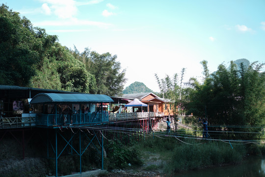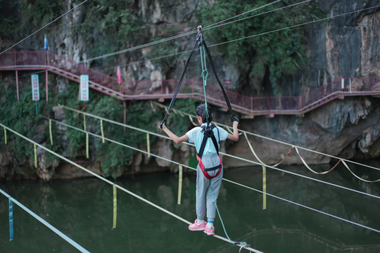 在景区入口处,还有一个非常惊险刺激的项目:步步惊心。一条条绳索横跨于江面上,单看着就觉得胆战心惊,更别说走上去了,非常适合胆子大的朋友来体验一下。