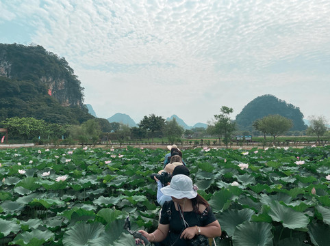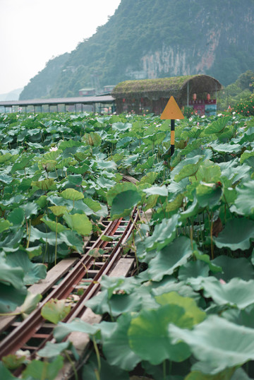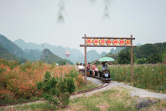 在这里,一定要坐一次峰林小火车!坐上绿色的小货车,慢悠悠穿越荷田、花海、湖面,全长约3公里,一路上的风景各不相同,特别是穿行于田田荷叶中的时候,朵朵荷花从身边划过,全身浸润在荷花的香气中,太美好了。