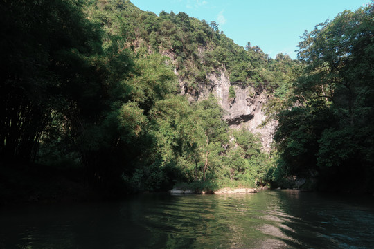 出了天坑,便来到一段两岸绿植葱翠的河道,由于气候湿润、氧气充足,河道两岸的树木格外葱郁,而且花草芬芳,数百种植物交错生长,阳光从树丛间穿过,照在波光粼粼的河面上,宛如仙境。