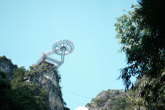 在山下便能看到一座悬空的圆形玻璃桥从山顶处延伸出来,既惊险又刺激,我们一行人便决定,先去玻璃桥,下山了再游天坑!