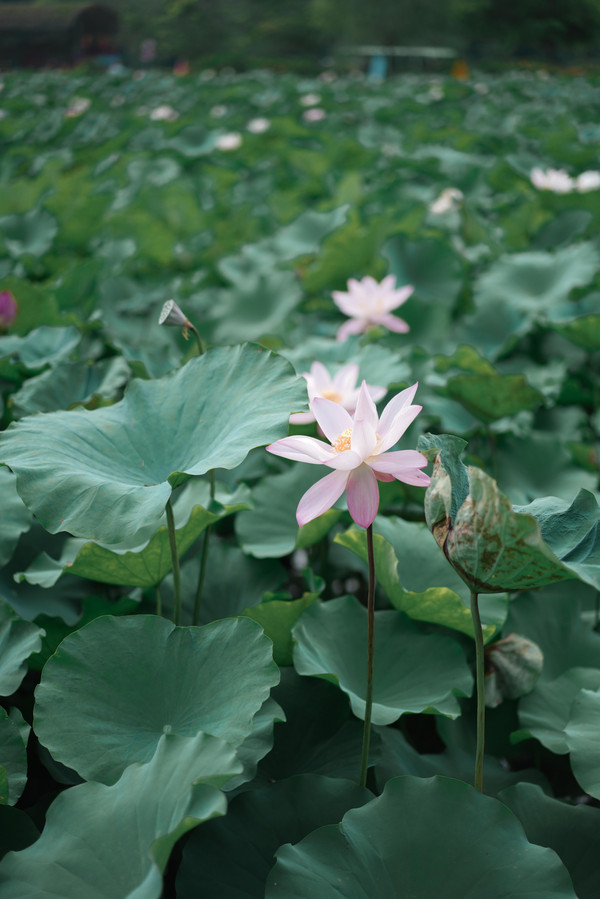 翠绿的荷叶丛中,亭亭玉立的荷花正盛开着,或白色或粉色,像一个个披着轻沙在湖上沐浴的仙女,含笑伫立,在微风中摇曳身姿娇羞欲语。