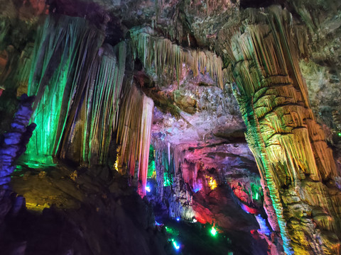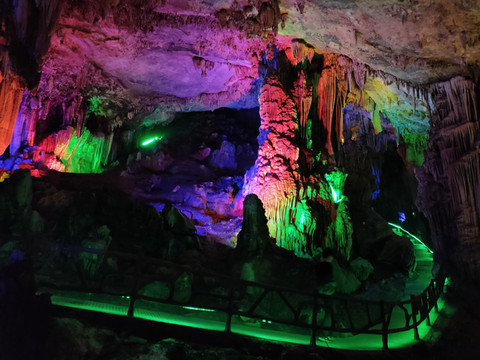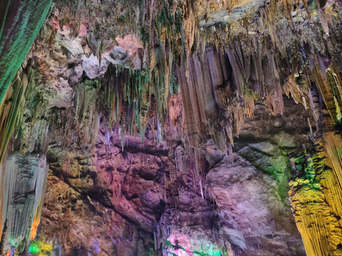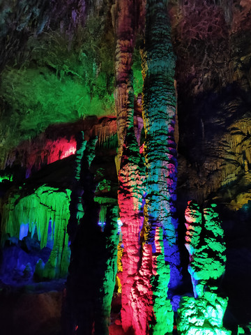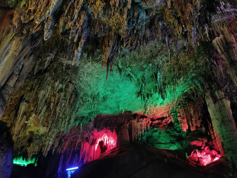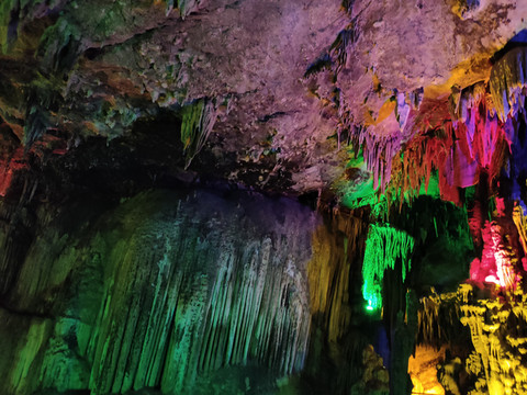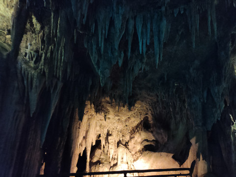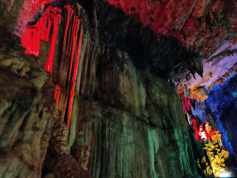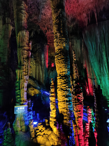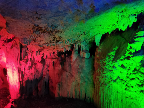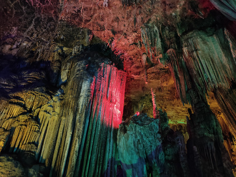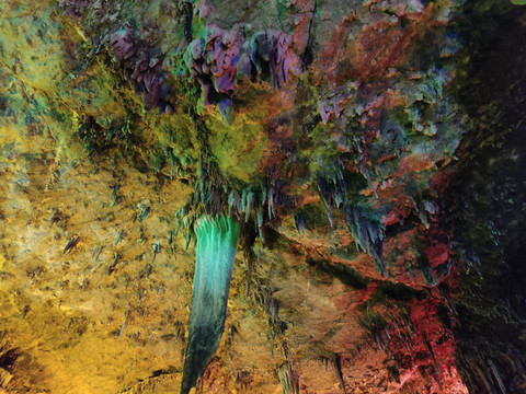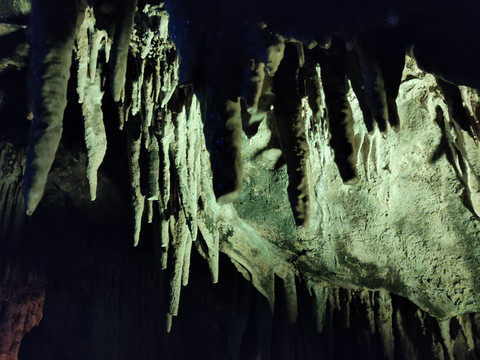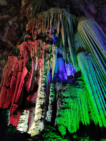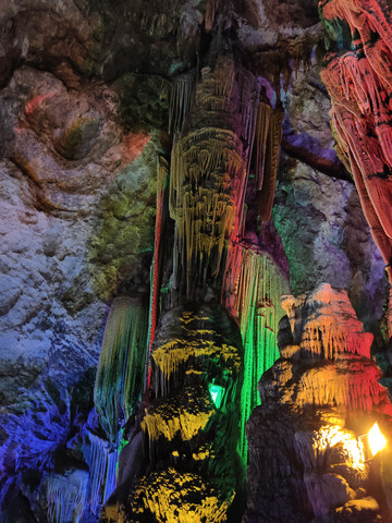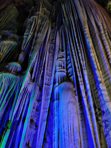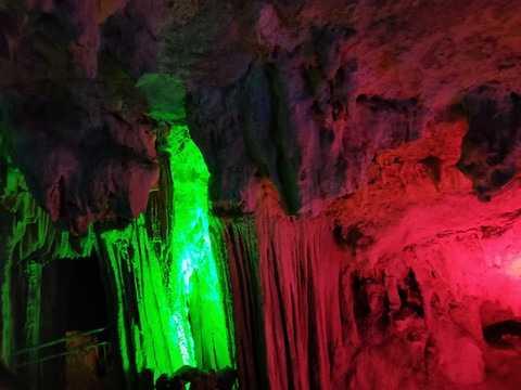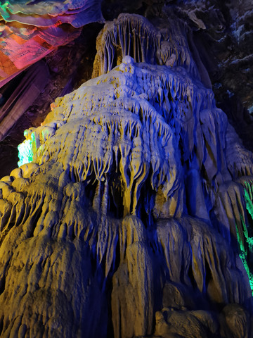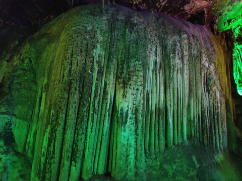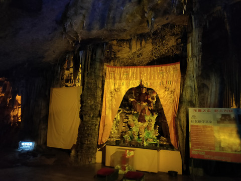 旁边还很应景地设了一处佛龛,供奉观音菩萨。这一带的灯光不那么绚丽,在洞的一角是白色光,能够看出钟乳石最本来的面目。其实没有这些赤橙黄绿青蓝紫的灯光,反倒显得更加真实。说实在的,即使没有彩色的灯光,这里也没有被命名为形象的名字,可是看起来还是很让人觉得震撼。主要是这里的钟乳石规模太大了,而且在常年潮湿气候的侵蚀下,它们显得十分光润细腻。