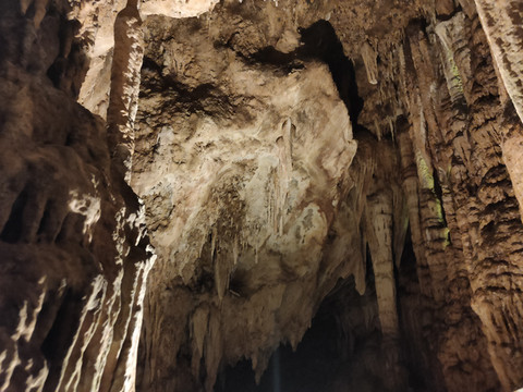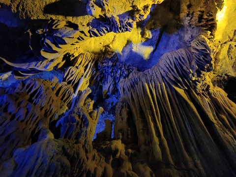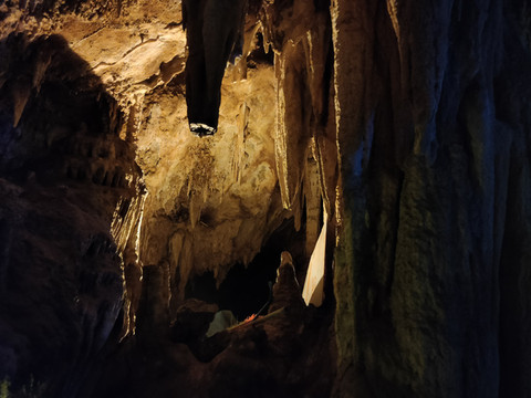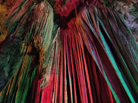 “宝珠幔帐”的规模很大,那细细长长的钟乳石,构成了一张华美的幔帐。层层叠叠的帐幔,显得十分华丽。有一幅幔帐从洞顶垂下,黄色的灯光打上去,看着也太华丽啦!