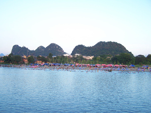 这并不是周末,只是工作日的一个傍晚。漓江岸边早已扎满了帐篷,到处都是玩水的市民。