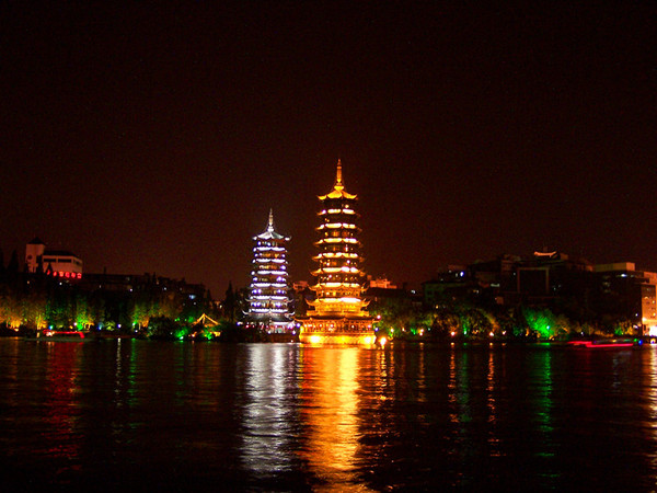 漫步漓江之后,乘着夜色,来观赏日月双塔。日月双塔始建于唐代,双塔之间以湖底18米的水下通道相连接,两座宝塔坐落于杉湖中,日塔为铜塔,月塔为琉璃塔,在灯光的映衬下,分别散发着金银两色光芒,倒映在湖中,异常璀璨美丽。