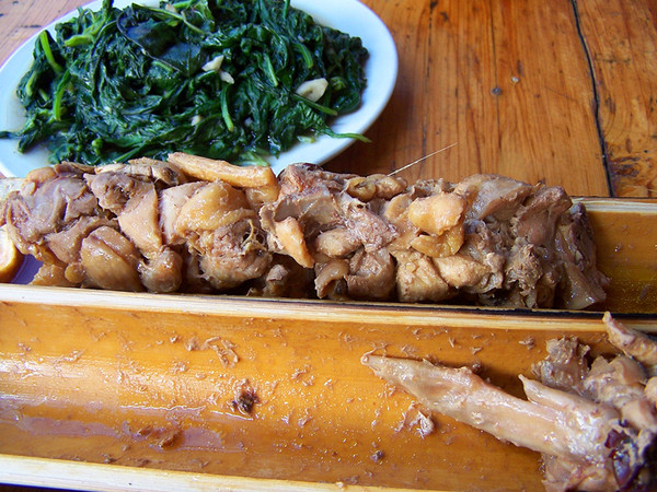 午餐点了当地特色的竹筒鸡,配了空心菜。价格不低,但确实物有所值。软烂的鸡肉中带着竹木的清香,混合出一种独特味道,让人赞不绝口。