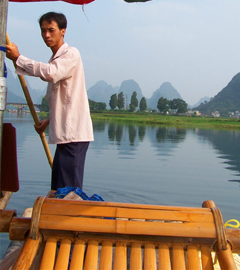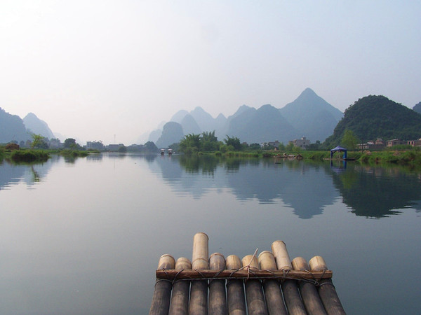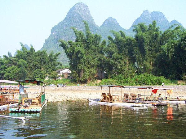 桂林山水甲天下,阳朔山水甲桂林。从桂林到阳朔,应该很少会有人坐汽车前往,因为沿漓江坐船顺流而下,不仅可饱览漓江秀色,更可直达阳朔。走水路有两种选择。一种是坐邮轮,速度快,乘坐舒适;另一种是乘坐竹筏,可随性停留观赏。我们选择了竹筏漂流。漓江竹筏漂流的是"杨堤—兴坪"古镇这一段,这是漓江最精华的部分。能够近距离接触到漓江的山水,途中所包含景点有鲤鱼挂壁,观音送子,九马画山,20RMB背景风光。竹筏很早之前已经联系好。我们从桂林坐汽车到杨堤,步行至村里的渡口,竹筏大哥已在此等候多时。