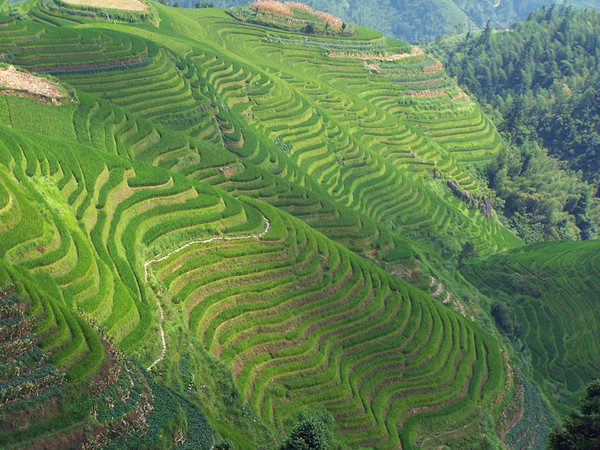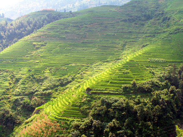 从观景台往下看去,稻田层层叠叠,犹如一幅油彩画作,向远处徐徐展开。古人智慧真是让人叹为观止,把水稻种在山脊之上,由上而下蓄水进行灌溉,日照也更为充足。但是灌溉水源可能是个问题,如山上无溪水河流,则只能从山下引水。听说有些梯田完全靠雨水浇灌,免去了引水之苦。和村里居民们攀谈,他们说此时并不是旅游旺季,人还比较少。景色最美、人最多的时候是国庆期间,所有住宿都会被订满。那时水稻已经成熟,颜色变为金黄。满山遍野的金色水稻,风吹过之后麦浪层叠,不由让人想起李健的《风吹麦浪》。在著名的梯田景观中,云南元阳梯田、湖南十八洞村、紫鹊界梯田也是老天给人类的上乘之作,只是一直未有机会前往。