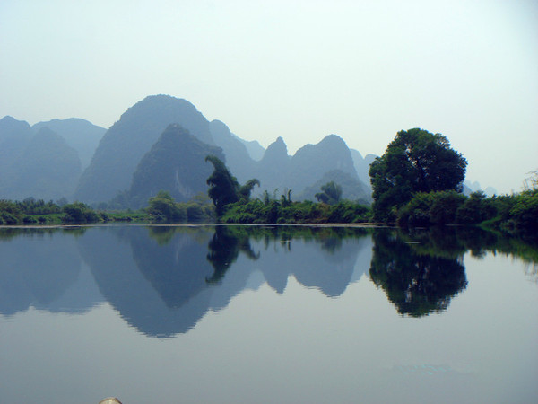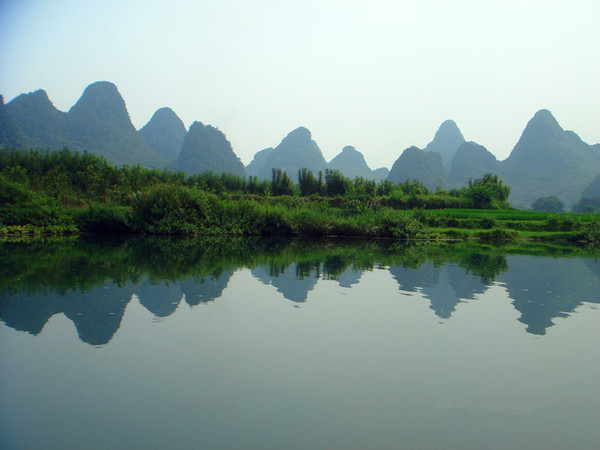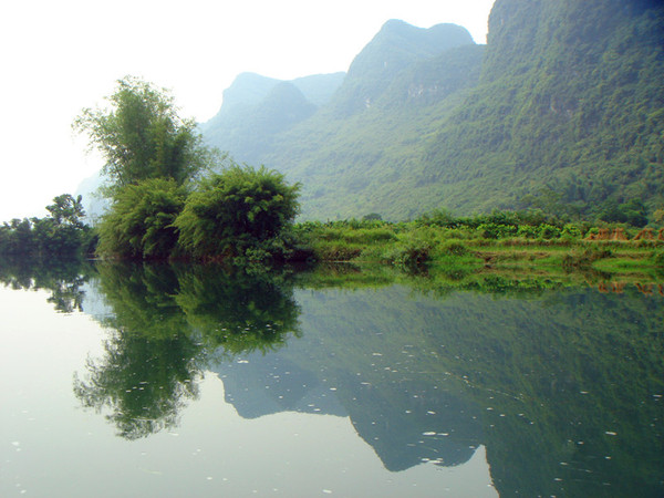 两侧岸边的凤尾竹倒映在水中,构成了阳朔特有的山水田园风光。