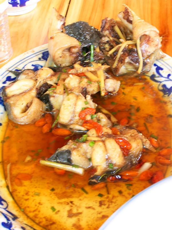 这应该是我记忆中吃过的最好的鱼肉,看照片配料只有姜丝、枸杞、葱、辣椒。不像巫山烤全鱼或是水煮鱼,因大量调味品掩盖了鱼肉的鲜味,终难保持原味,难达至臻之境。