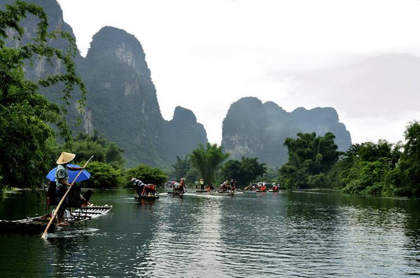 漓江:漓江是喀斯特地形典型地段,人称百里漓江、百里画廊。新版人民币20元背面图案,正是漓江山水的一段。漓江在不同天气下风味多姿,晴天青峰倒影,阴天漫山云雾,雨天烟雨如梦。游漓江的主要方式有坐船、竹筏及徒步,坐船分精华游、阳朔水上游、市区水上游。
