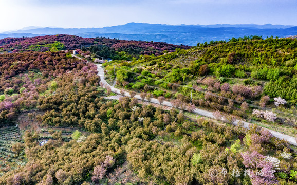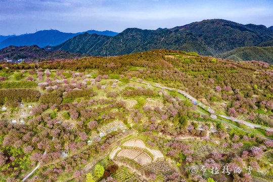杖锡樱花园内,万亩樱花开满四明山山头,如云似霞。