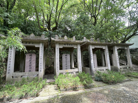 四先贤故里碑:为纪念余姚市先贤严子陵 王阳明 黄梨洲 朱舜水所建 故名 严子陵 王阳明两故里碑建于清乾隆十九年 朱舜水 黄梨洲两故里碑建于清末 四碑原置城西郊江边的“接官亭”处 抗战时期迁至旧县衙内的荷花池畔 后移至龙泉山南坡