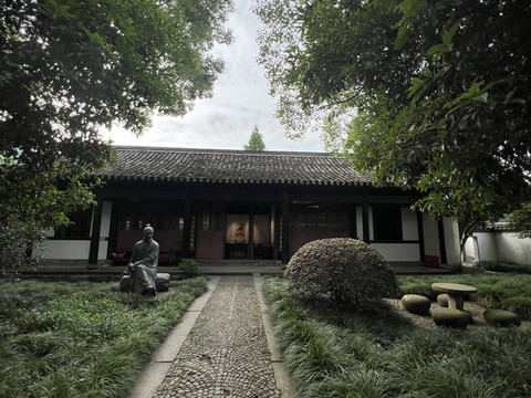 房前草地上立有一尊束发短须,手握书卷,坐在石头上直目凝神的黄宗羲雕像。