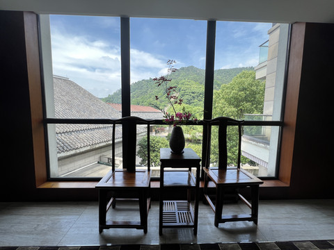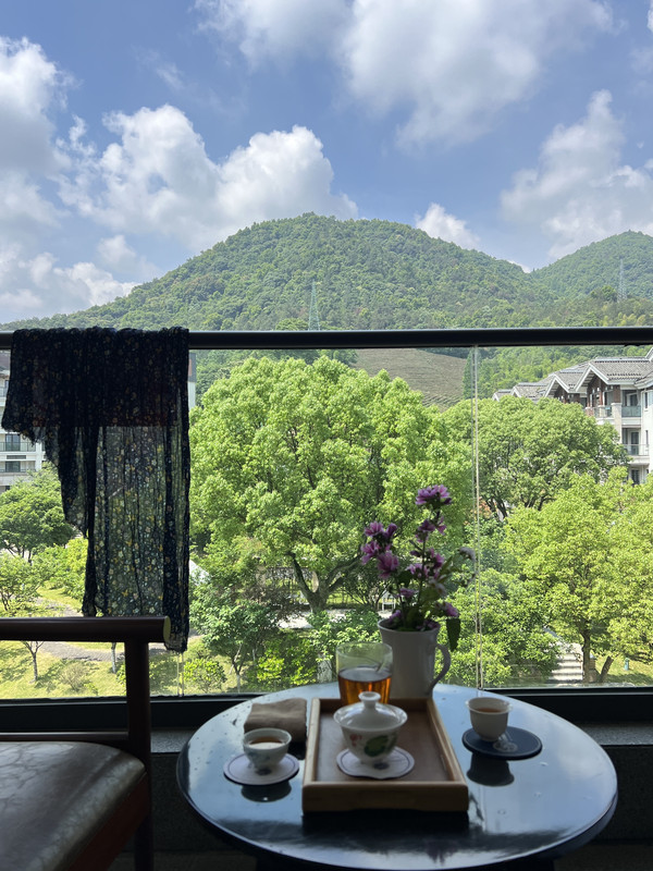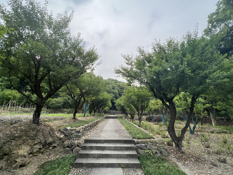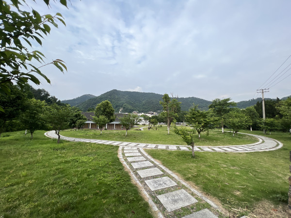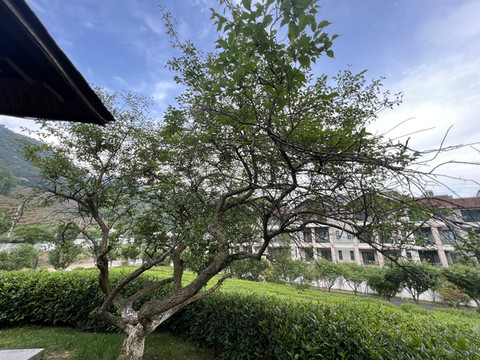 客房中心是片山坡 山坡中心有座供休息的亭子 四周是一片茶园 山坡中心对角线上栽种了两棵李子树 一棵纪念王阳明 一棵纪念黄梨洲
