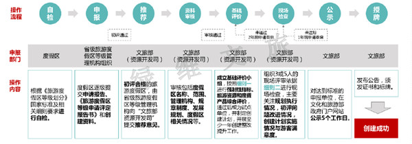 创建国家级旅游度假区共要经历八大步骤:自检、申报、推荐、资料审核、基础评价、现场检查、公示与授牌。国家旅游度假区原则上从省级旅游度假区中评选,各省具有自己的评审规定。