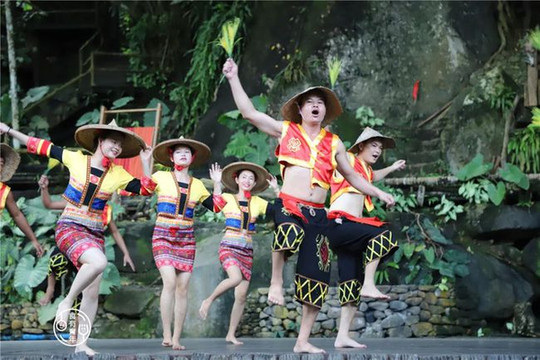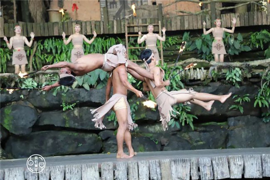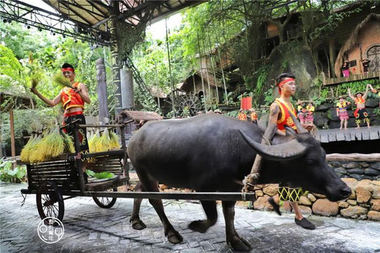 看大型实景《槟榔·古韵》,我还上台互动撸了一顶槟榔叶帽子,给旅行增添了许多黎苗风情。