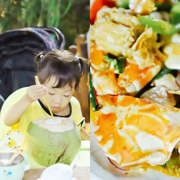 吃饭适合配上一个海南的大椰子,丰盛满足的海鲜大餐。