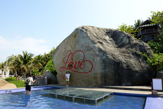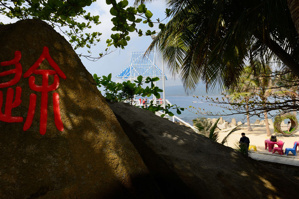 我们慢慢往回走,一块大石上雕着鲜艳的花朵,向海上伸出一个平台,原来这里是婚纱拍摄专用点。