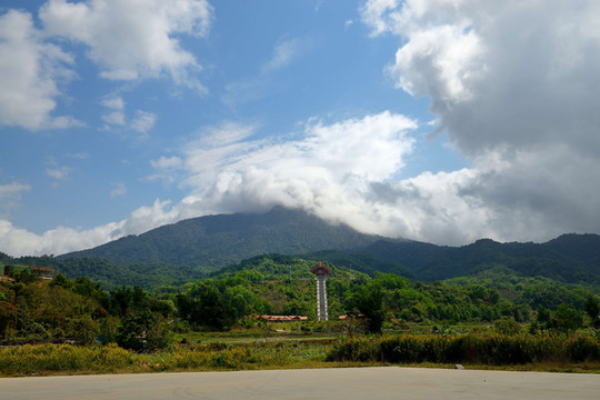 从景区出来下到山脚,这里有个旅游服务中心,五指山的景点基本上都分布在这一区域内。在服务中心广场,我们停车远观五指山,但怎样看也看不出五指来,而且主峰一直被云雾遮盖。