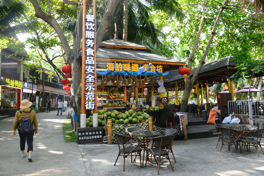 这里有很多椰子买,每个价格6、7元。在五指山市场每人买了一个,椰子很大很重,椰汁很多,清甜无比,味道很好,但汁太多一个人确难喝完。晚饭后继续散步。
