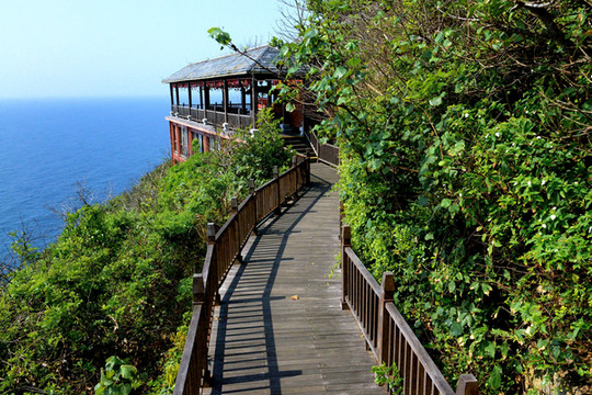 走在山边的栈道,可观赏浪花、海滩、怪石。
