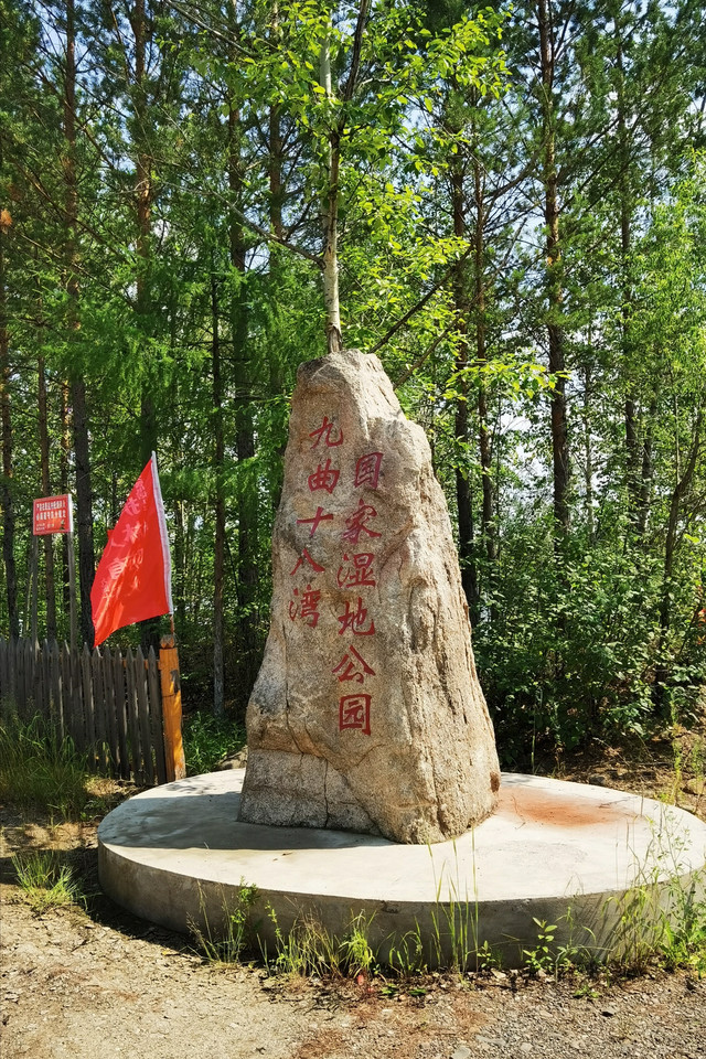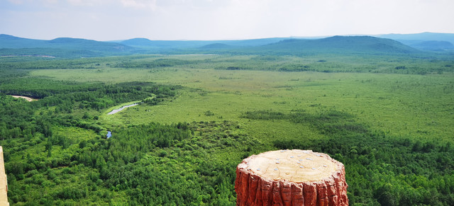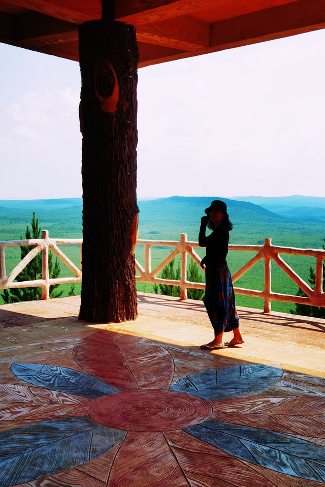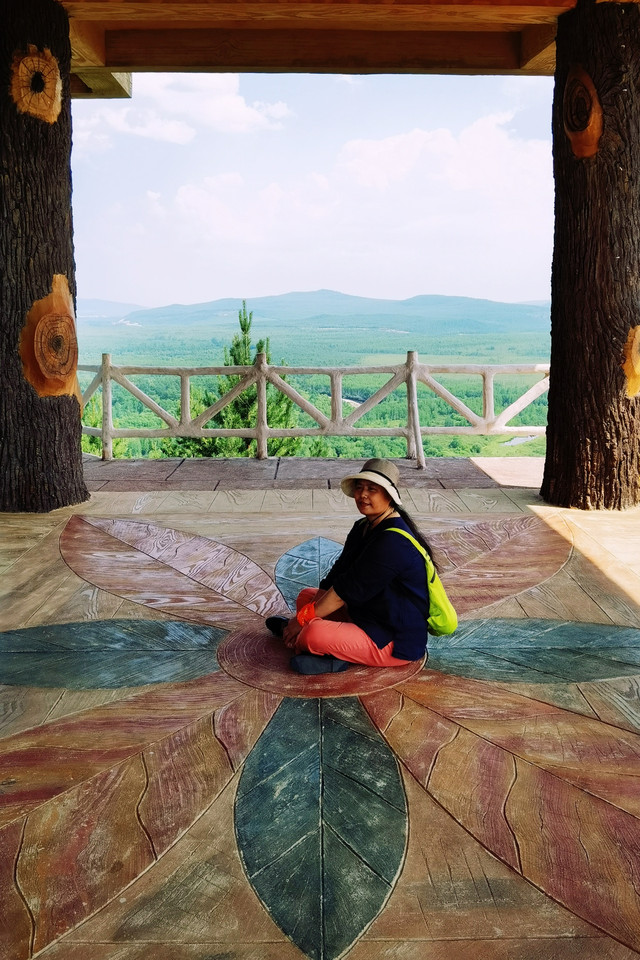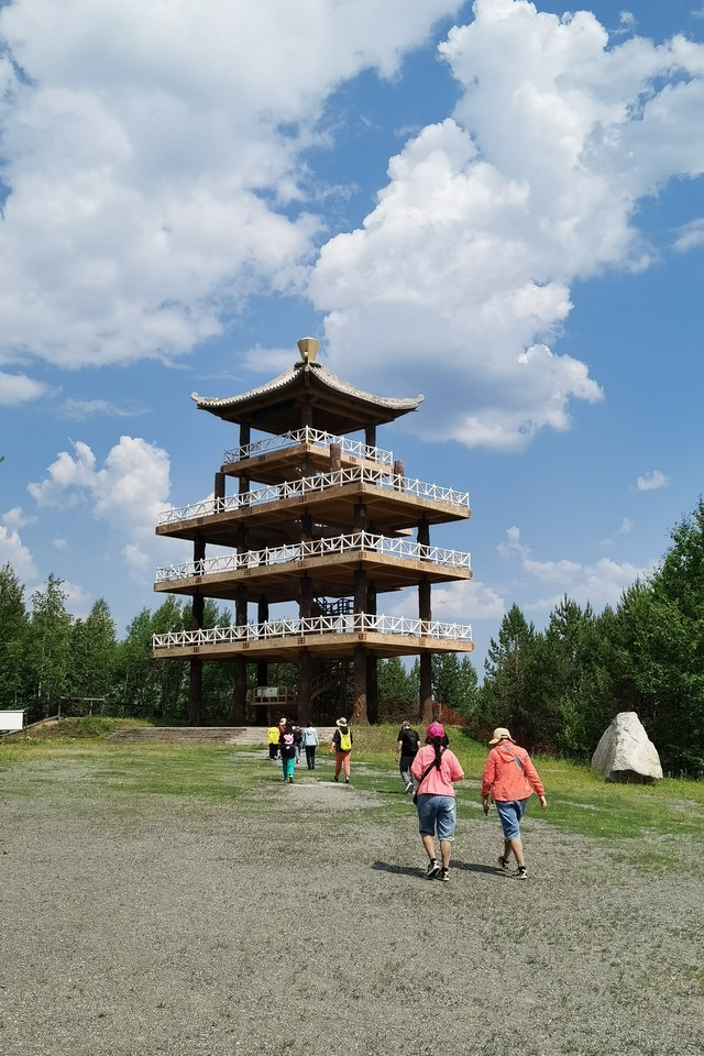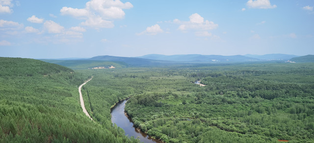 路上经过额木尔河九曲十八弯,登上腾龙阁观景台举目观望,由近及远森林茂密,层层叠叠,一片绿的海洋,远处山峦延绵起伏,额木尔河从密林深处洒脱自如的款款而来,一路上孕育出一个九曲十八弯湿地。树木太茂盛使得河流掩映在密林之中,平台上看效果不明显,如果是航拍或许能体现出更多道弯。